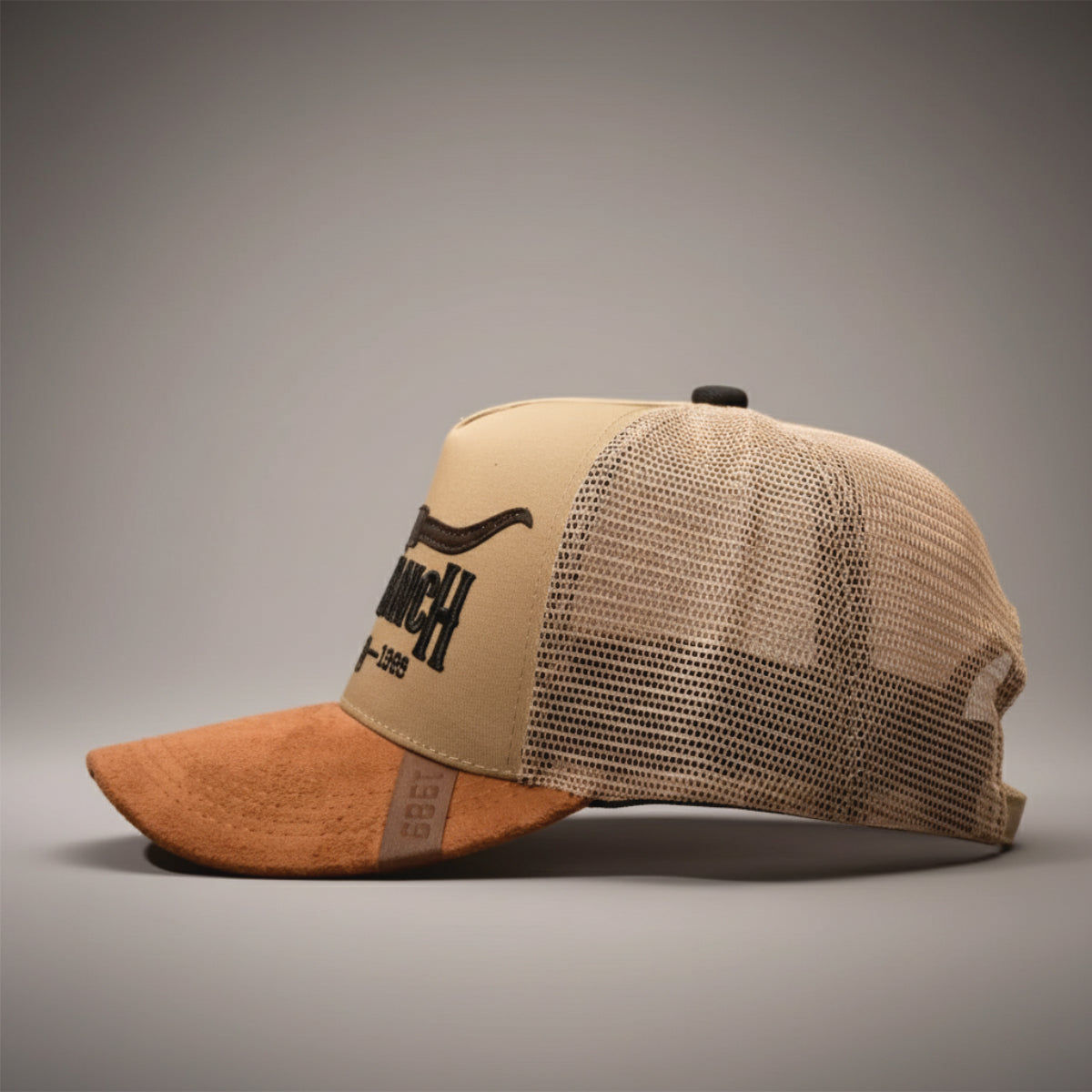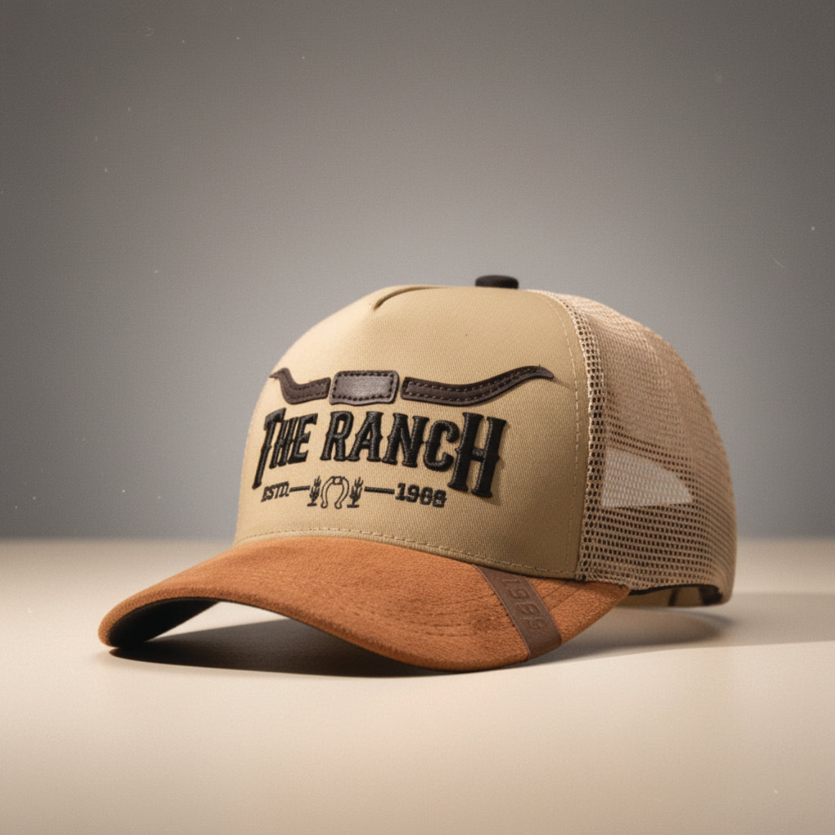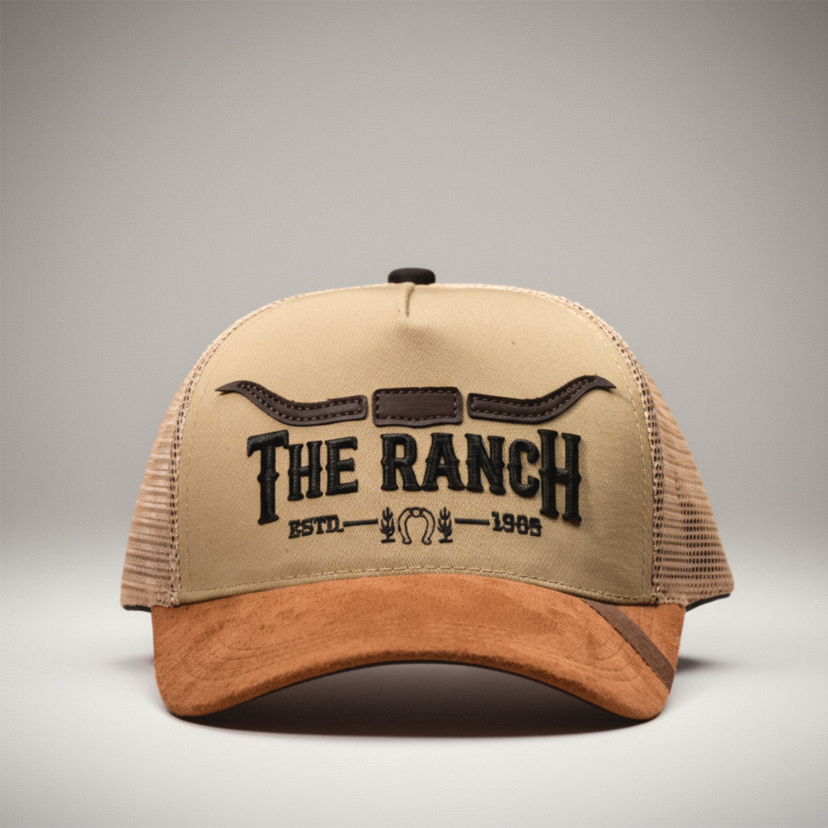 Está fabricada en dril americano de alta resistencia, con visera en gamuza tono tierra y malla posterior transpirable que aporta frescura y comodidad. En el frente lleva un bordado 3D de “The Ranch” con cuernos largos y el año 1989, un emblema de tradición y fuerza.