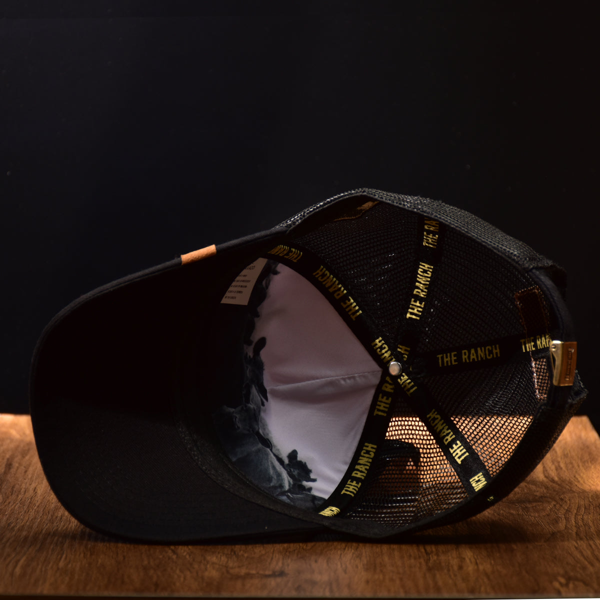 🧵 Interior forrado con cintas negras y tipografía dorada “THE RANCH”